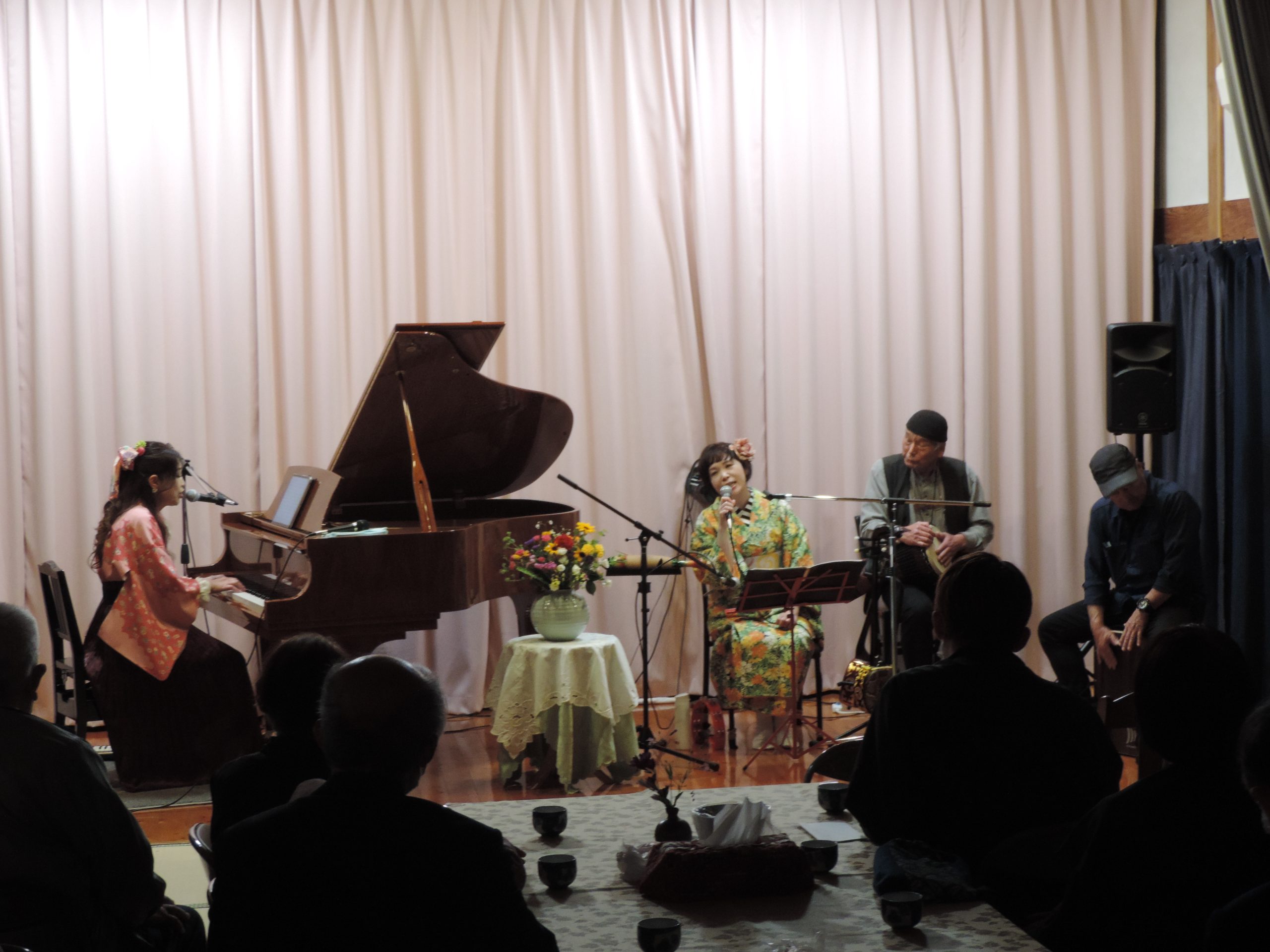 沖縄の歌や懐かしい誰もが口ずさんだ昭和の歌を三線と唄の矢野郁美、ピアノと唄の児玉真由子のお二人が演奏してくださいました。